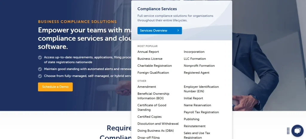 - A comprehensive compliance dashboard that tracks filings, deadlines, and documents.